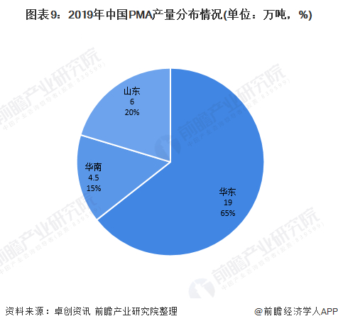 从产品供应来看,2019年中国PMA产能主要分布在华东、山东、华南为主,其中华东地区实际产能为19万吨,占比64.41%,华南市场实际产能为4.5万吨,占比15.25%,山东地区实际产能为6万吨,占比20.34%。