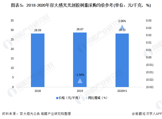 从供应价格来看,2018-2020年,应用于光刻胶的树脂供需基本稳定,价格变化波动不大,以容大感光(容大感光是我国PCB光刻胶生产企业之一)的树脂采购价格作为参考,在28元/千克左右。