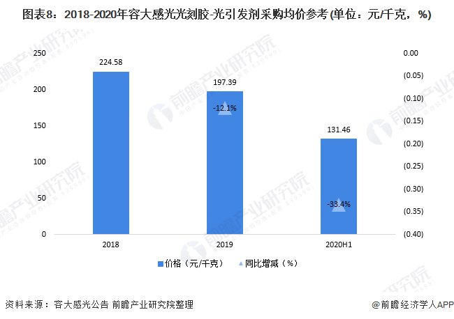 从光引发剂的采购价格来看,以容大感光披露的数据来看(容大感光是我国PCB光刻胶生产企业之一)2018-2020年,随着上游供应商的竞争结构逐渐稳定,该公司采购的光引发剂价格总体下降,2020上半年的采购均价为131.46元/千克。
