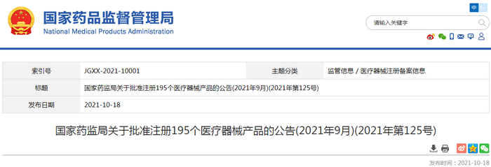 原标题:国家药监局:9月共批准注册195个医疗器械产品