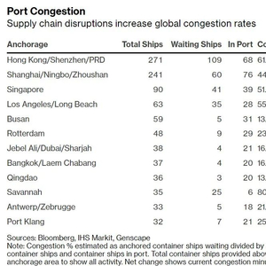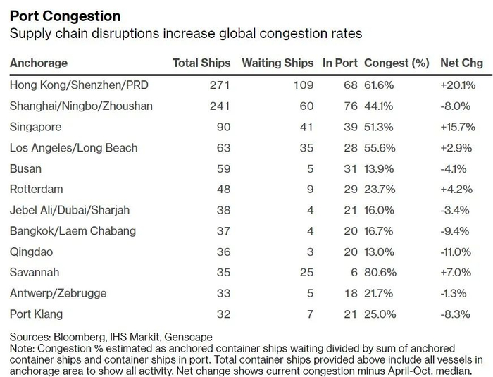 彭博社报道称,数据显示,大量货物在多国港口积压,其中美国东海岸的佐治亚州萨凡纳港在本周四晚些时候有25艘等待的船只,而在港的只有6艘,拥堵率达80.6%,是所有大港口中最拥堵的。而在西海岸,邻近的洛杉矶港和长滩港等待的船只超过了在港的船只,10月15日的拥堵率累计达55.6%。