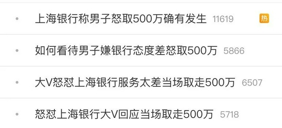 这情节过于“霸道总裁”,再加上粉丝众多关注度高,该微博立刻引发网友围观讨论,多次登上微博热搜,其中“上海银行回应客户取现五百万”还登上热搜第一。这其中究竟发生了什么?