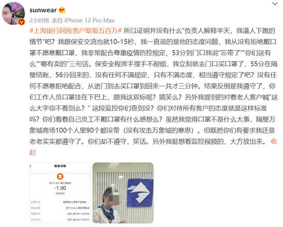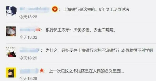10月16日,微博大V@sunwear发文称,国庆前他去了趟上海银行虹梅路支行,该行多个工作人员服务态度很差,他决定把储存在该行的几千万元都取出来转存他行,并于10月16日一次取现500万元。