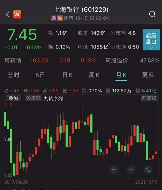 今年6月以来,上海银行股价经历近两个月下跌后持续震荡,截至15日股价为7.45元/股,相比年内最高价下跌11.8%,最新市值为1058亿元。