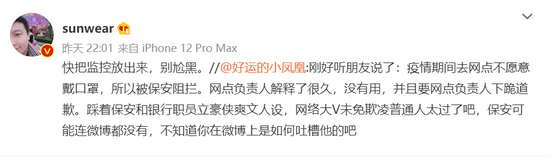 对于事件的经过,一位网友发文称,“该大V疫情期间去网点不愿意戴口罩,所以被保安阻拦。网点负责人解释了很久,没有用,并且要网点负责人下跪道歉。”