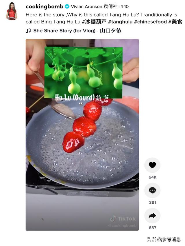 TikTok华裔创作者@cookingbomb也是一位拥有230万粉丝的美食博主,她在系列视频中详细讲解如何制作正宗中国糖葫芦。