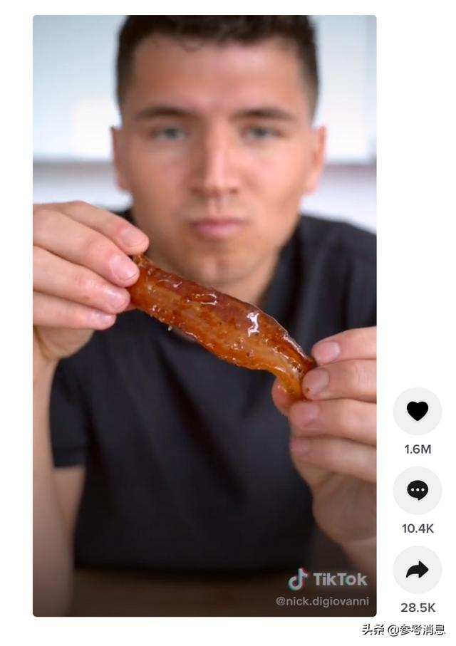 大家都知道,煎好的培根是酥脆的,@nick.digiovanni对自己制作的培根糖葫芦赞美不已。“我从未见过如果透亮的培根,”他咬上一口,直呼味道绝美:“我们找到了让培根更美味的方法。”