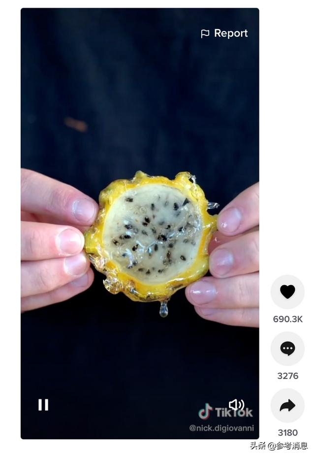 坐拥730万粉丝的创作者@nick.digiovanni突发奇想,做了一个火龙果的糖葫芦。为了防止果肉散架,他并没有削掉火龙果的皮,而是直接把水果在糖浆中滚了一圈。