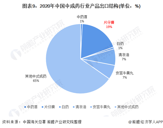 片仔癀,为国家中药一级保护品种,处方和工艺受国家保护,传统制作技艺列入国家非遗名录,单品种出口连续多年位居中国中成药外贸单品种出口前列,成“海丝”路上“中国符号”。2020年,中国中成药行业出口产品片仔癀(税则号30049052),出口金额为3551.43万美元,占比为18.77%。