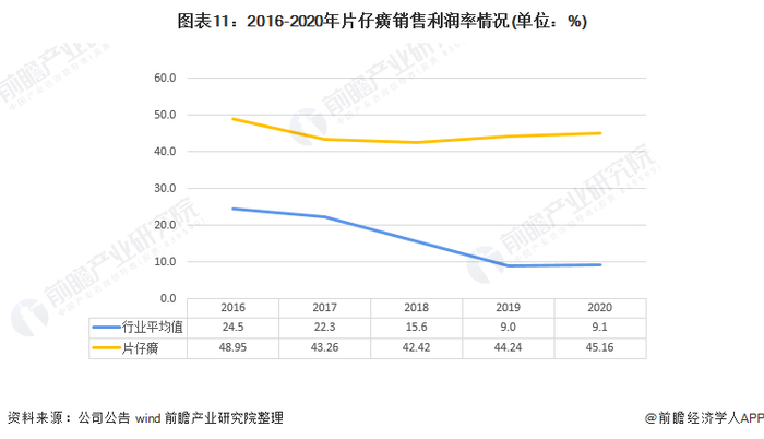 2016-2020年片仔癀销售利润率一直保持在较高水平,在40%以上,高于行业均值。