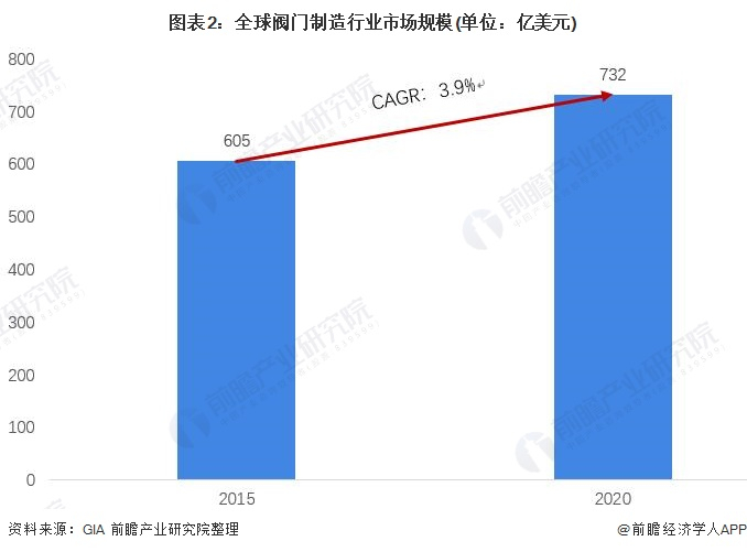 由于阀门制造行业出现较早,在世界范围内整体市场的发展较为完备,因此近年来增速并不快,2015-2020年复合增速仅为3.9%。根据GIA的数据,2020年全球阀门制造行业的市场规模为732亿美元。