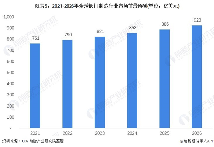 根据GIA的数据,预计在2026年,全球阀门制造行业的市场规模能够超过900亿美元,达到923亿美元左右。2021-2026年,5年年复合增速为3.9%。