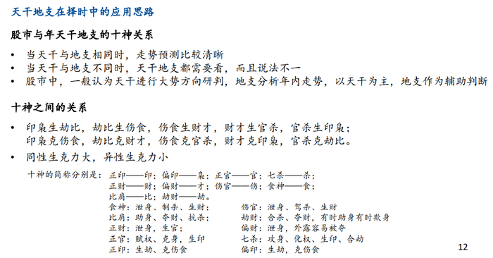 此外,PPT详细阐释了股市与年天干地支的十神关系,称“股市中,一般认为天干进行大势方向研判,地支分析年内走势,以天干为主,地支作为辅助判断。”
