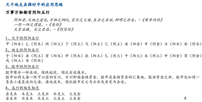 而在天干地支在择时中的应用思路方面,PPT写道:“股市也有阴阳五行,股市像水一样流动,涨跌起伏,因此应该属水。”