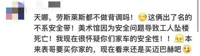 有网友进一步指责劳斯莱斯的失职:“劳斯莱斯都不做背调的吗,这俩出了名的不系安全带!美术馆因为安全问题导致工人坠楼死亡!我现在很怀疑你们家车的安全性!!”