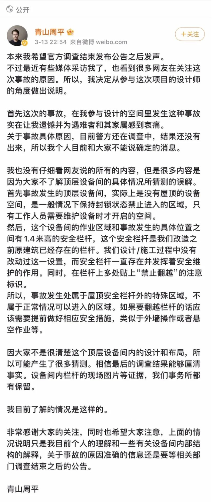 同一天晚上,设计师青山周平在微博上对事故表达了悲痛,同时解释称,该区域属于屋顶安全栏杆外的特殊区域。随后,木木美术馆再次发声,称意外发生处不在当日委托的规定作业范围以内。
