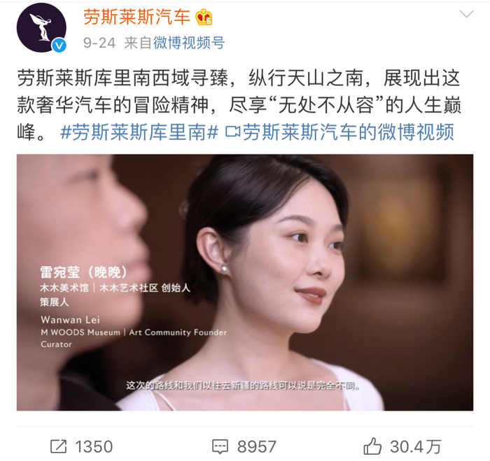 这次他的发言,与新近发布了宣传视频的豪车品牌劳斯莱斯有关。9月底,劳斯莱斯的宣传推广视频里出现了“网红”晚晚(本名雷宛萤)与丈夫林瀚的采访,两人向来是舆论场里争议较多的人物,视频一出,发酵愈加明显。@劳斯莱斯汽车的官方微博曾经无人问津,当晚就引来2000多条评论。