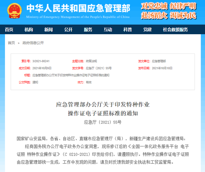 原标题:特种作业操作证电子证照标准印发 来源:中国应急管理