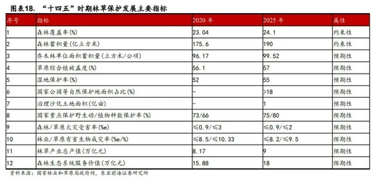 我国森林覆盖率及蓄积量提升是必然趋势。“十三五”期间,我国林业草原保护规划主要任务全面完成,生态状况明显改善,森林覆盖率达到23.0%,森林蓄积量达到175.6亿立方米,草原综合植被盖度达到56.1%,湿地保护率达到52%,治理沙化土地1.5亿亩。林草局、发改委联合印发《“十四五”林业草原保护发展规划纲要》,提出两项约束性指标:到2025年,森林覆盖率达到24.1%,森林蓄积量达到190亿立方米,附加湿地保护率达到55%,林草产业总产值达到9万亿元等十项预期性指标。此外,中国向国际社会承诺:2030年,中国森林蓄积量将比2005年增加60亿立方米。这一目标更新了2015年我国提出的国家自主贡献中,森林蓄积量比2005年增加45亿立方米的目标。