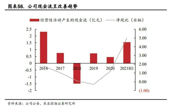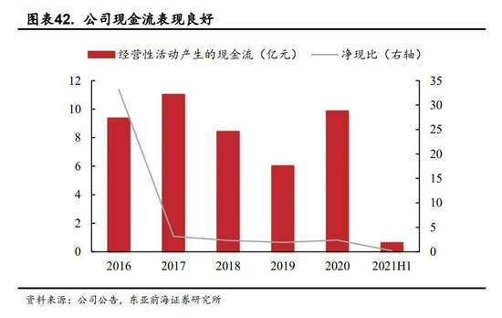 公司现金流表现良好。2016-2020年,公司经营活动产生的现金流量净额分别为9.4/11.0/8.4/6.0/9.9亿元,同期净现比为33.2/3.2/2.3/1.9/2.4。2021年H1,公司经营性活动产生的现金流量净额为0.64亿元,去年同期为4.45亿元,同比-85.6%,主要原因系上年同期,经营性结构存款2.4亿元释放,本期无此项现金流入。