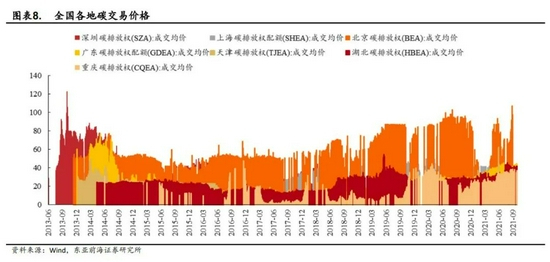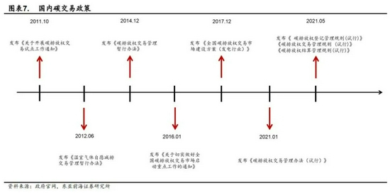 2011年10月,国家发改委发布《关于开展碳排放权交易试点工作的通知》,确立了7个国内碳排放权交易试点(北京市、天津市、上海市、重庆市、深圳市、广东省、湖北省),标志着我国碳排放交易正式启动。2013年,7个试点省市开始展开碳交易工作。2014年12月,国家发改委发布《碳排放权交易管理暂行办法》,明确了全国碳市场建立的主要思路和管理体系。2017年12月,国家发改委发布《全国碳排放权交易市场建设方案(发电行业)》,标志着全国碳排放交易体系完成了总体设计,并正式启动。2021年1月,生态环境部发布《碳排放权交易管理办法(试行)》;2021年5月,生态环境部发布《碳排放权登记管理规则(试行)》、《碳排放权交易管理规则 (试行)》、《碳排放权结算管理规则(试行)》,意味着国家为加快推进全国碳市场建设提供了更加有力的法制保障。