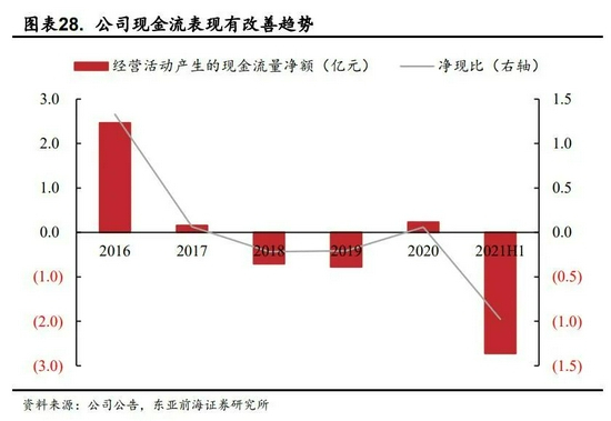 公司现金流表现有改善趋势。2016-2020年,公司经营活动产生的现金流量净额分别为2.5/0.2/-0.7/-0.8/0.2亿元,同期净现比为1.3/0.1/-0.2/-0.2/0.1。2021年H1,公司经营性活动产生的现金流量净额为-2.7亿元,去年同期为-2.8亿元,现金流有所改善,主要得益于公司采取多种措施加大工程款的回笼。
