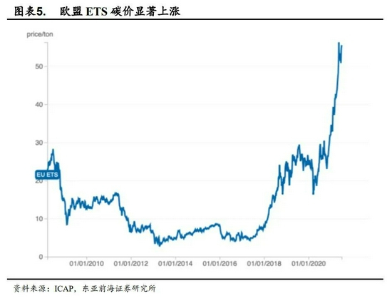 从国内市场来看,目前仍以碳排放配额(CEA)交易为主,国家核证自愿减排量(CCER)交易为补充。2021年7月16日,全国碳排放权交易市场正式通过上海环境能源交易所开市,首批2225家发电企业将分到碳排放配额,这些企业碳排放量超过40亿吨二氧化碳,意味着中国碳排放权交易市场一启动就成为了全球覆盖温室气体排放量规模最大的碳市场。从碳配额价格来看,欧盟碳价为60欧元/吨左右,而我国碳价在50元人民币/吨水平,未来上升空间大。