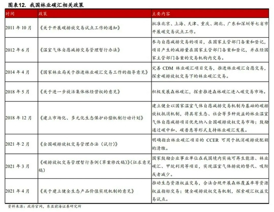 林业碳汇相关政策陆续出台,推动行业发展。2012年6月,随着CER价格受供给过剩的影响不断下跌,国家开启CCER备案管理。2017 年3 月,由于CCER供给过剩导致价格不断下跌,国家暂缓实施《温室气体自愿减排交易管理暂行办法》,CCER 项目备案申请及减排量备案均暂缓受理。2021年3月,我国生态环境部发布的《碳排放权交易管理暂行条例(草案修改稿)》(征求意见稿)中指出可再生能源、林业碳汇、甲烷利用等项目的实施单位可以申请国务院生态主管部门组织对其项目产生的温室气体削减排放量进行核证。2021年4月,中共中央办公厅、国务院印发《关于建立健全生态产品价值实现机制的意见》,提出要推动生态资源权益交易,合法合规开展森林覆盖率等资源权益指标交易,健全碳排放权交易机制,探索碳汇权益交易试点等。
