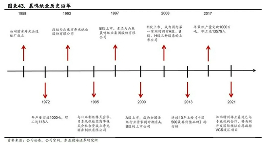 山东晨鸣纸业集团股份有限公司,前身为寿光县造纸厂,成立于1958年,1997年B股上市、2000年A股上市、2008年H股上市。历经60余年的发展,公司现已成为国内浆纸一体化发展的造纸龙头企业,在全国各地拥有六个生产基地,年浆纸产能超千万吨。公司造纸产品涵盖高档胶版纸、白卡纸、铜版纸、轻涂纸、生活纸、静电复印纸、热敏纸等系列,截至2021年H1公司主要产品市场占有率均位于全国前列,其中文化纸市场占有率第一,白卡纸、铜版纸市场占有率均为第二。