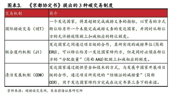 碳交易机制包括配额和抵消额的交易机制,《京都协定书》中提出3种国际碳交易机制:1)国际排放交易(IET)——发达国家与发达国家交易配额;2)联合履约机制(JI)——发达国家与发达国家交易减排量;3)清洁发展机制(CDM)——发达国家提供资金和技术,与发展中国家开展合作后形成的减排量可用于发达国家本国,以抵消本国碳排放。