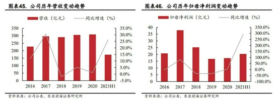 公司营收稳健增长,归母净利润波动较大。2016-2020年,公司营收增长稳健,CAGR为8.0%;同期归母净利润波动较大,由2016年的20.6亿元上升到2017年的37.7亿元,后下降至2020年的17.1亿元,期间CAGR为-4.6%。2021年H1,公司实现营收171.7亿元,同比+26.3%,主要得益于公司机制纸产品销售量价齐升;实现归母净利润20.2亿元,同比+291.4%。