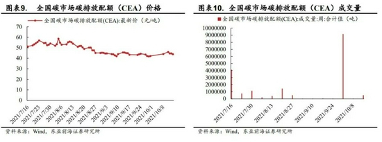 全国碳排放配额(CEA)价格稳定在50元/吨左右,活跃度提升。自2021年7月16日开市以来,全国碳排放配额价格稳定在50元/吨左右,每周成交量波动较大,但整体活跃度呈提升趋势。从最新数据来看,2021年10月11日-10月15日当周,全国碳交易市场碳排放配额(CEA)总成交量49.81万吨,周成交额2194.81万元,周成交均价44.06元/吨。