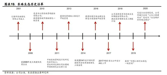 东珠生态环保股份有限公司,前身为无锡市东珠绿化有限公司,成立于2001年,并于2017年9月在上海证券交易所主板上市。公司主营生态治理、市政绿化、公园广场、地产景观等场景设计、施工和养护业务,是一家综合性生态环境修复与园林景观建设服务商,拥有集苗木种植、生态景观设计、生态修复与景观工程建设、景观养护为一体的全产业链集成运营能力。此外,公司响应碳中和背景下国家政策的号召,积极布局碳交易业务,于2021年7月与上海环境能源交易所以及绿色技术银行签订战略合作协议,并于2021年8月成立东珠碳汇(上海)生态科技有限公司,林业碳汇业务未来或成新的业绩增长点。