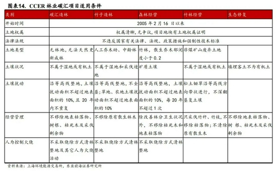 我国林业碳汇开发的林地需符合CCER认证的方法学。有国家备案的方法学才可以申请林业碳汇项目备案和减排量签发,目前,国家发展改革委批准备案的方法学包括碳汇造林项目方法学、竹子造林碳汇项目方法学、森林经营碳汇项目方法学、竹林经营碳汇项目方法学以及小规模非煤矿区生态修复项目方法学,不同方法学具有严苛的使用条件(详见图表5)。此外,申请CCER林业碳汇项目需要有林权证、造林作业设计单位资质、林业主管部门作业设计批复、树种和树苗采购合同及栽种记录等文件。