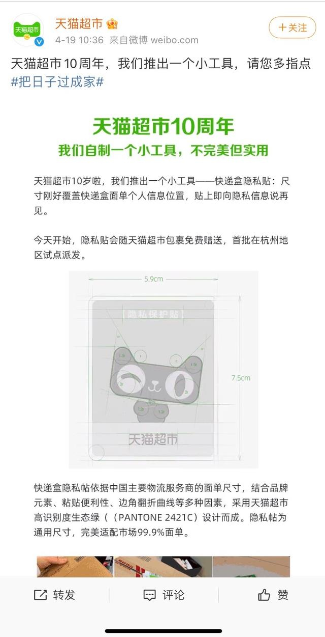 此外,今年4月19日,天猫超市宣布,正在通过快递包裹随箱赠送快递盒隐私贴。隐私贴能通过覆盖快递盒面单,一定程度上避免个人信息泄露问题。据天猫超市介绍,经过设计的隐私贴方便粘贴,防边角翻折,能够适配市场中99.9%的快递盒面单尺寸,首批隐私贴在杭州地区试点派发。