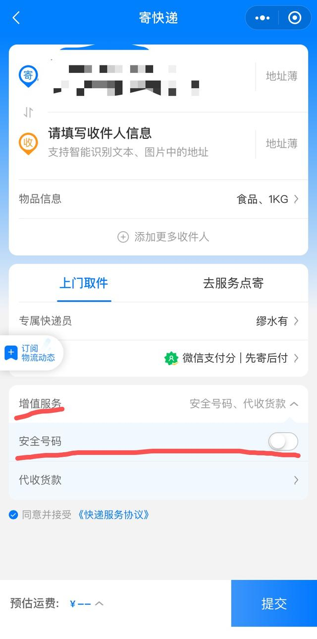 在圆通速递小程序上,记者寄件时会出现“隐私面单”的增值服务,点击后才能显示该服务内容,选择开启,收件人姓名和电话不出现在运输环节。