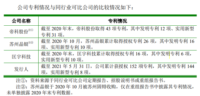 海外专利并购让聚和股份的专利数量激增。2021年5月31日,聚和股份累计已获授权152项专利。据公开数据,截至2020年底,早在2020年6月已经上市的同行公司帝科股份共取得43项专利。其他同行业可比公司中,截至2020年10月,苏州晶银累计取得授权专利26项;截至2020年末,匡宇科技累计取得授权专利16项。