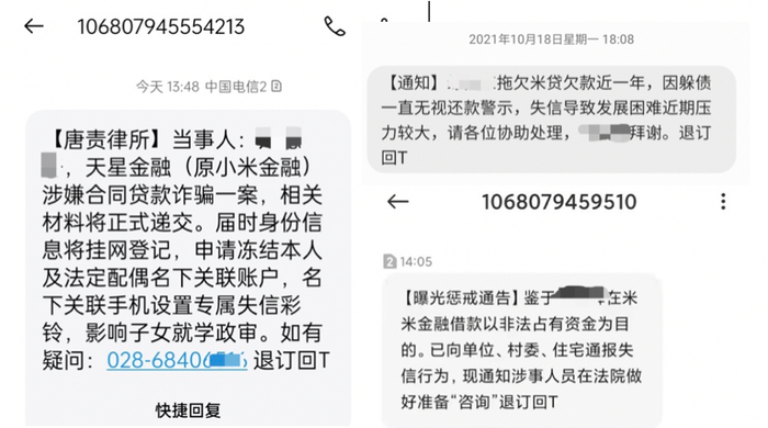 此前,曾有报道指出,天星数科旗下小米随星借被投诉滥用呼叫系统进行电话轰炸。据黑猫投诉平台近期的几则投诉,投诉者晒出短信,有自称当事人表示收到疑似律所短信,提及涉嫌合同贷款诈骗;亦有表示亲友收到短信显示,某用户米贷欠款近一年,请各位协助处理。