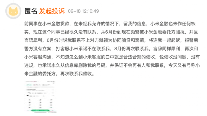 有一则匿名投诉表示,自6月起频繁被小米金融委托方骚扰,联系不上借款人就视为协同骗贷和窝藏,借款人系很久没联系的前同事,并表示拨打客服后,小米承诺不再联系,尔后又有号称小米金融的委托方,再次联系其催收。