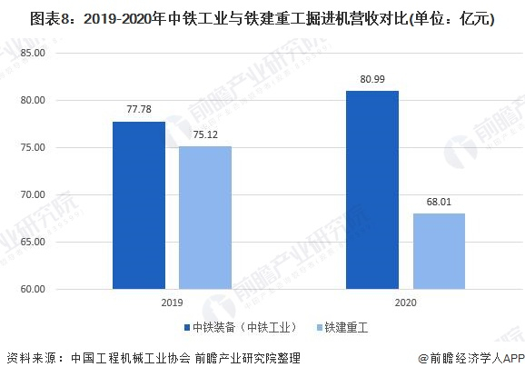 在盾构机业务方面,根据中国工程机械工业协会掘进机械分会统计,2019-2020年中铁工业和铁建重工的掘进机业务销售收入中,中铁工业均要高于铁建重工。2020年中铁工业的掘进机业务营业收入共有营业收入80.99亿元,铁建重工的掘进机业务营业收入则为68.01亿元。