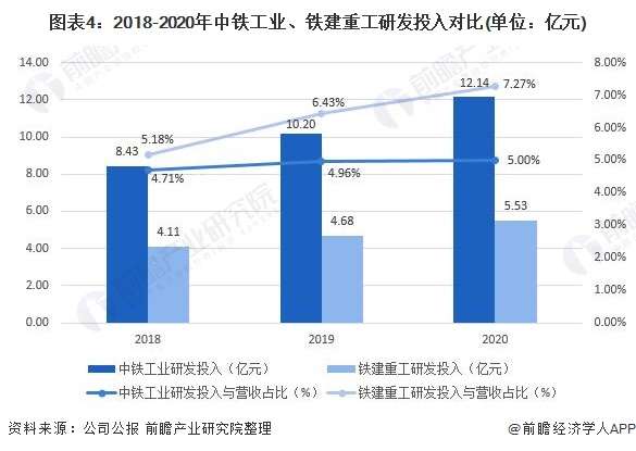 从中铁工业和铁建重工的研发占比情况来看,中铁工业的研发投入规模要明显高于铁建重工,2020年中铁工业共投入研发资金12.14亿元,铁建重工共投入研发资金5.53亿元。不过从研发投入占公司营收的比例来看,铁建重工的投入比例7.27%要略高于中铁工业的5.00%。