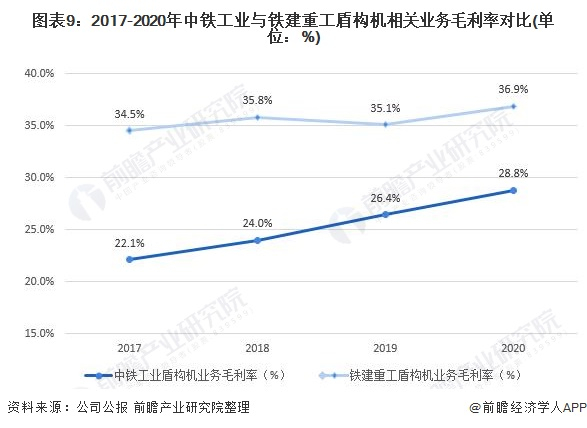 从中铁工业和铁建重工的掘进机相关业务毛利率来看,2017-2020年铁建重工的盾构机相关业务毛利率均高于中铁工业。2020年铁建重工的盾构机相关业务毛利率约为36.9%,中铁工业的盾构机相关业务毛利率约为28.8%。