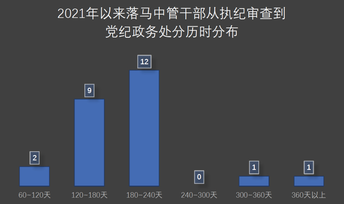 从执纪审查到党纪政务处分历时长短也有很大不同,其中历时最短的是青海省人民检察院原党组书记、检察长蒙永山,由于蒙永山为主动投案,仅75天便审查清楚并对其进行了党纪政务处分。历时最久的则是公安部原党委委员、副部长孙力军,从去年4月19日执纪审查,至今年9月30日才对其进行了党纪政务处分,历时529天。
