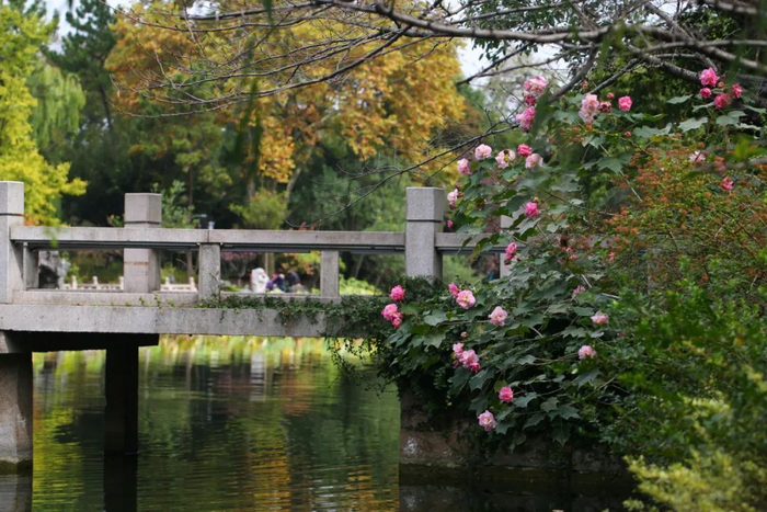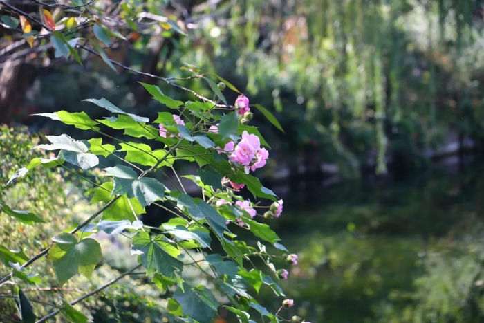 古猗园内,木芙蓉主要集中于老园区,位于石舫驳岸边的一株临近水而栽,率先开放,朝开暮谢,花形似牡丹,游客坐在石舫上,就能欣赏到木芙蓉的美观。九曲桥南侧也是傍水而植,与水上的木芙蓉遥相呼应,开得明丽雅致。