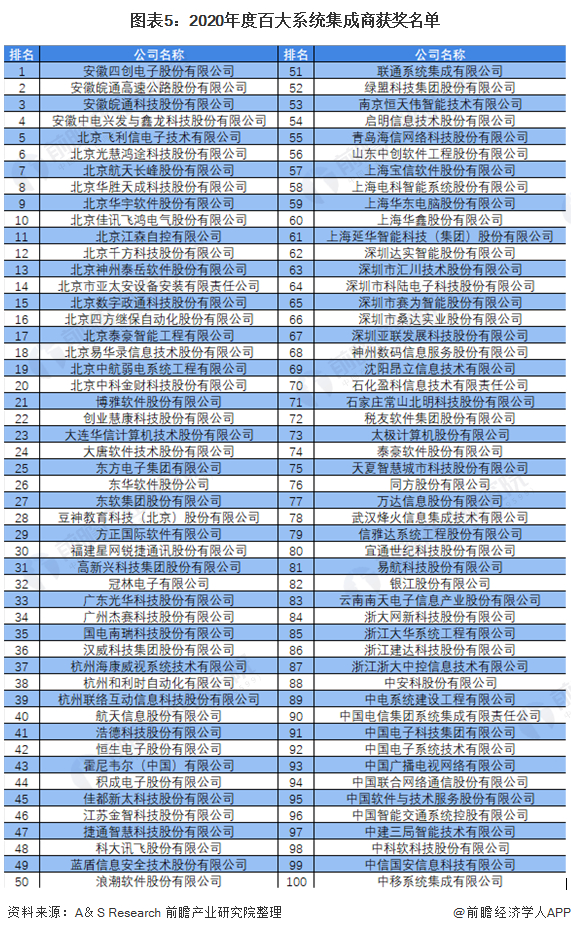 2020年,A&S Research发布了《2020年度百大系统集成商获奖名单》,其中排名前三的系统集成商分别为安徽四创电子股份有限公司、安徽皖通高速公路股份有限公司以及安徽皖通科技股份有限公司。