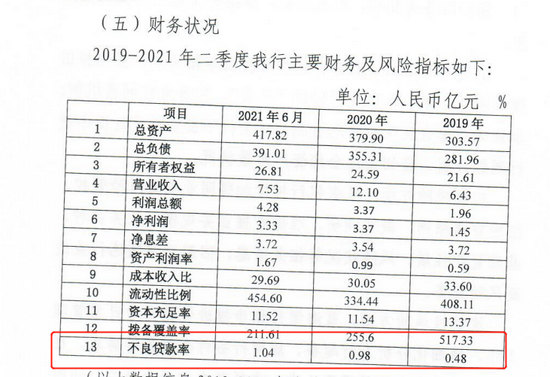 数据显示,2020年,蓝海银行的个人经营贷款余额从上年的11.62亿元增长至17.64亿元,同比增幅达51.81%。当年整体不良率从上年的0.48%上升至0.98%。截至2021年上半年底,蓝海银行不良贷款率继续上行至1.04%,较2020年末增加了0.06个百分点。