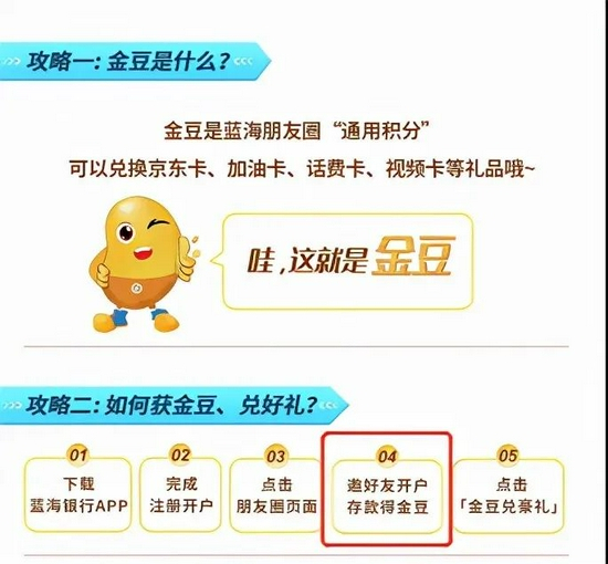 或是为了增加自营App的用户注册数量和存款活跃度,记者了解到,近期蓝海银行推出了朋友圈“抢金豆”活动。用户通过邀请好友开户存款就可获得“金豆”,即一种积分形式,再通过兑换获得购物卡、话费充值卡、京东卡、加油卡等权益。例如,每成功邀请1名好友开户存款,最高可获得1000金豆,可兑换10元京东卡。不过,根据“银行不得违规返利吸存,通过返还现金或有价证券、赠送实物等不正当手段吸收存款”的监管规定,蓝海银行的上述做法或涉嫌打擦边球。