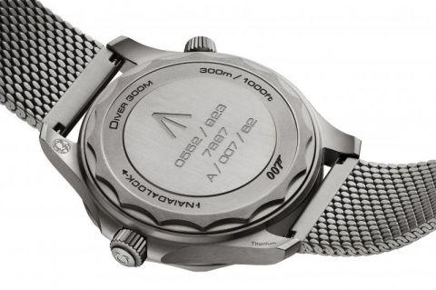 在腕表的背面镌刻有一系列007 腕表的独有代码,包括代表英国军用物资的箭头标志(也出现于表盘6 点钟位置)和英国皇家海军的专用代码“0552”。至于“007”当然是詹姆斯·邦德这位传奇特工的专属编号,而数字“62”则代表着第一部007 电影登上银幕的年份(1962 年)。底盖通过品牌独家的NAIAD LOCK 技术定向旋紧,确保镌刻的数字和图案始终保持正确的方位。