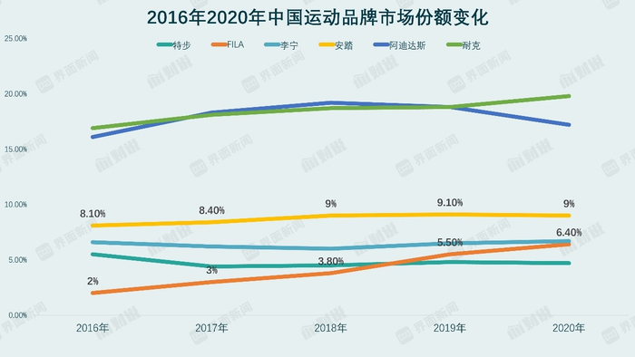 从国内运动鞋服市场发展历程看,单一品牌年销售体量达到或者超过100亿-200亿区间后,增速普遍放缓。即便表现较优的安踏主品牌(ANTA)近年也只能维持10%-20%增速,耐克及阿迪达斯则更低一些。