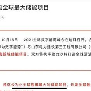 图:华为签约全球最大规模储能项目的消息。来源:华为智能光伏公众号